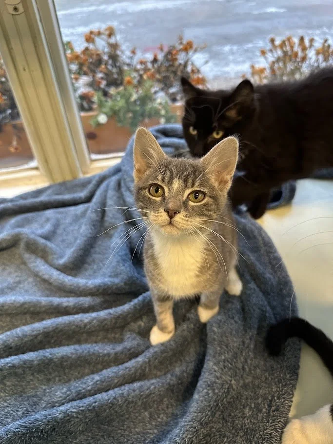 Information: female, Domestic Short Hair, gray & white, approximately 4 months old, FIV/FeLV-, spay & microchip included in adoption