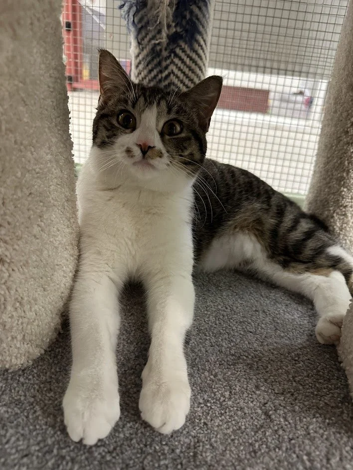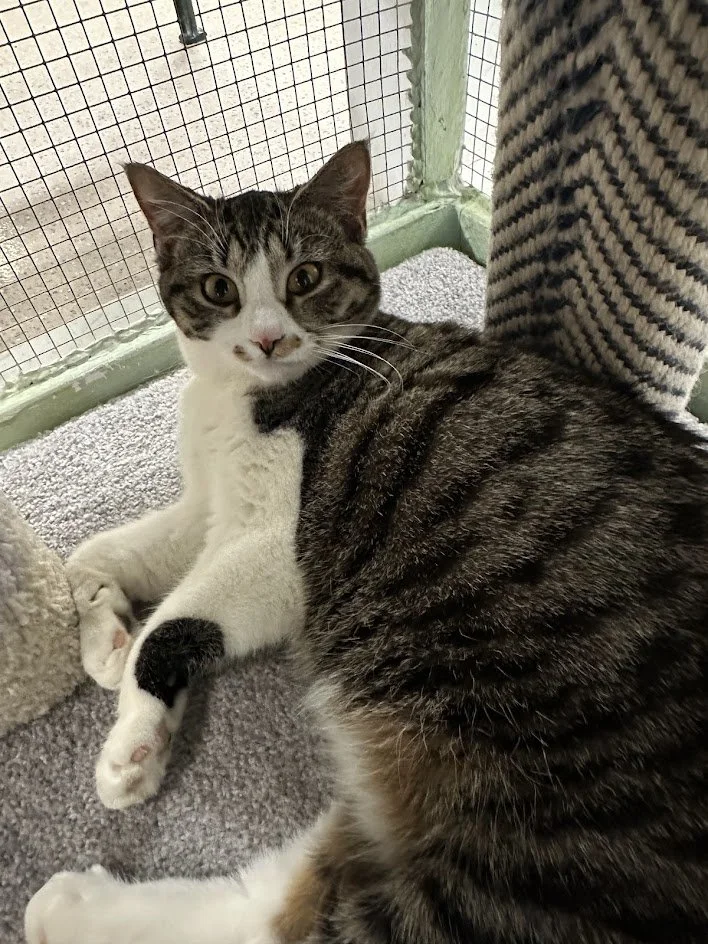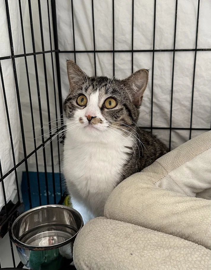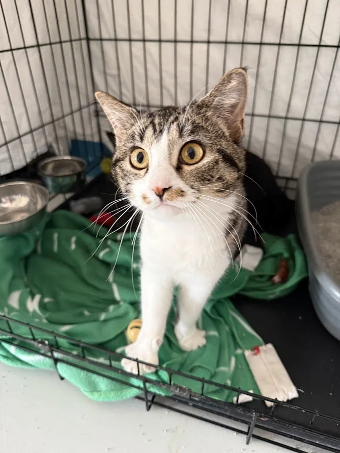 Information: female, Domestic Short Hair, brown tabby with white, approximately 10 months old (DOB~4/20/25), FIV/FeLV-, spayed, microchipped