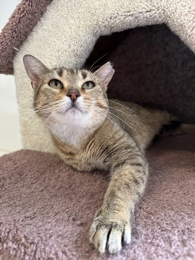 Information: female, Domestic Short Hair, brown tabby with white, approximately 2 years old (DOB~3/12/24), FIV/FeLV-, up-to-date on vaccinations, spayed, microchipped