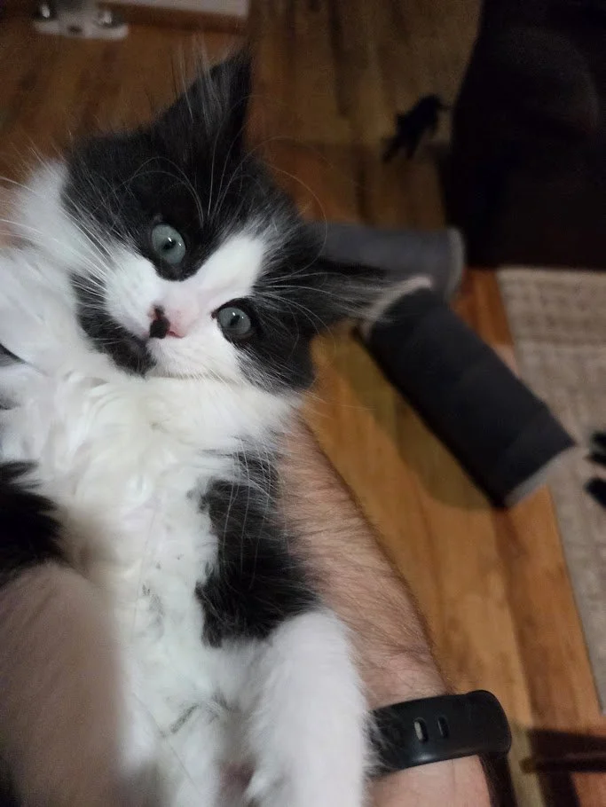 Information: male, Domestic Long Hair, tuxedo, approximately 3 months old (DOB~8/3/25), FIV/FeLV-, up-to-date on age-appropriate vaccinations, neuter & microchip included in adoption
