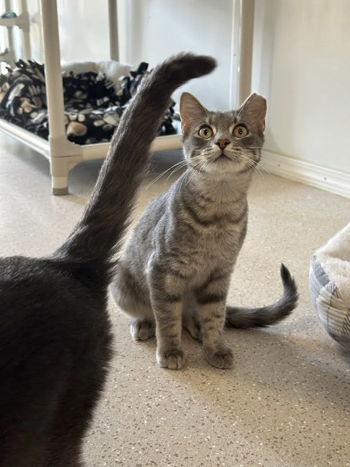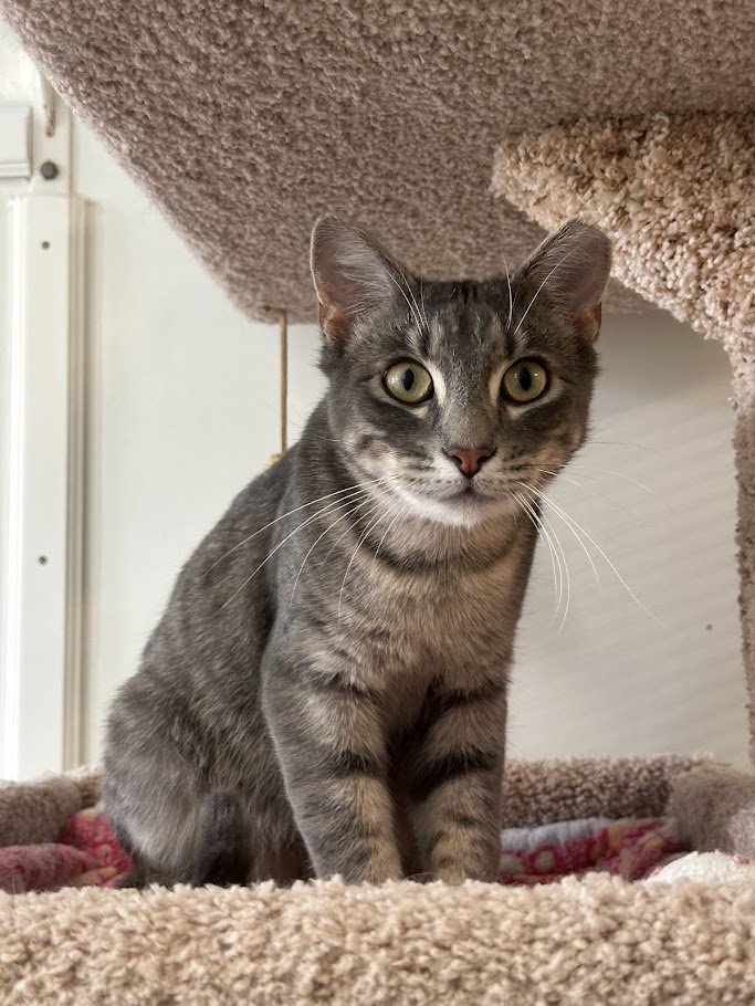 Information: male, Domestic Short Hair, gray tabby, approximately 7-8 months (DOB~9/2/25), FIV/FeLV-, up-to-date on vaccinations, neutered, microchipped