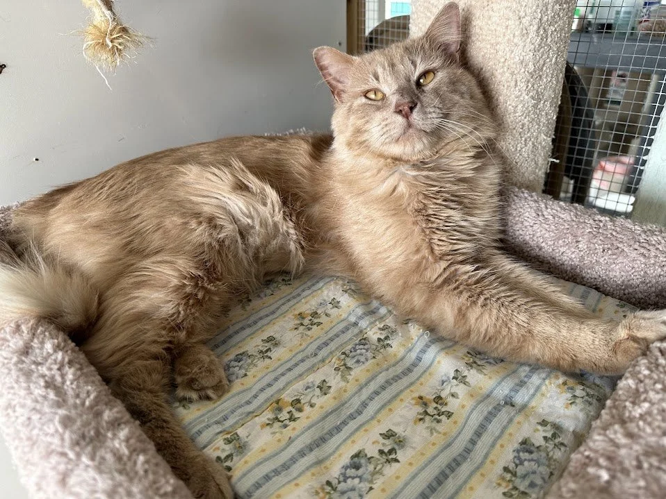 While Mufasa spends most of the time hanging out in his own personal space, he happily greets visitors and requests pets every day. He enjoys the company of most other cats, but not in a playful way; he prefers to have a lounging buddy and would be a good match for another chill cat. Mufasa could also thrive as a solo cat. As long as he has daily attention, a comfortable spot to rest, and a family to love, he’s content!