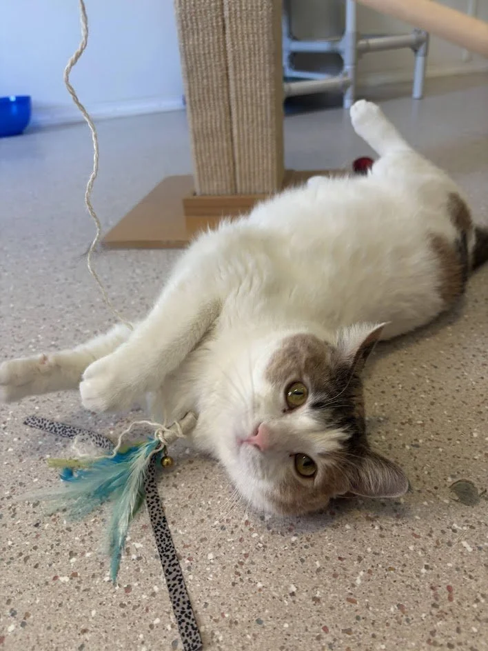 Seems more interested in attention and pets over playtime, but might rediscover her playful side once she’s established in a cozy home