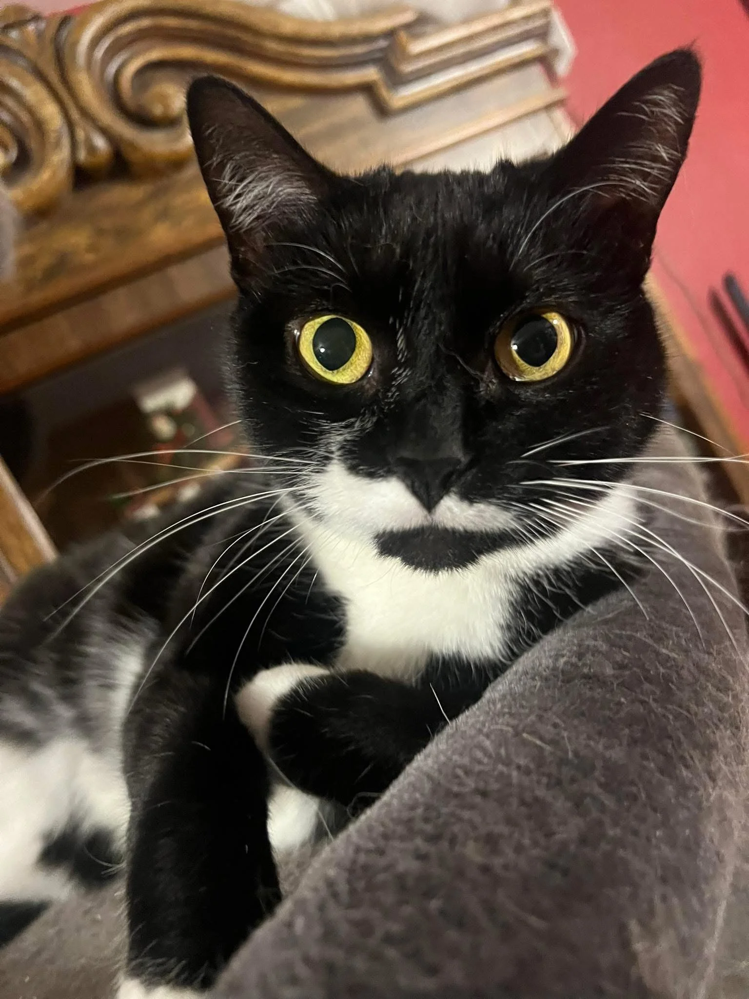 “Sassy is the type of cat to do her own thing. She rarely will lay in your lap to cuddle. She only wants pets when she wants them. However, she does lay in bed with me every night. She’s very tolerant of my almost 2 year old daughter, and my very high energy dog.”