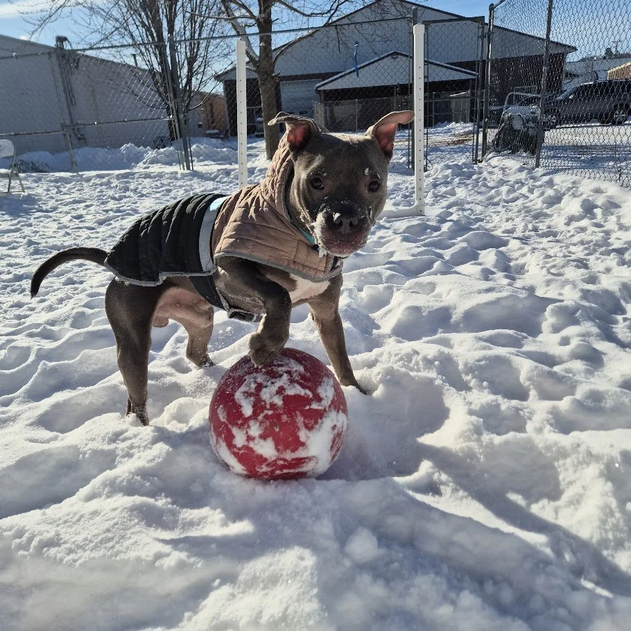 Tazman’s favorite activities include daily walks (sporting a spiffy jacket, of course), thoroughly enjoying his toys, and working on skills for treat rewards. Taz’s treat-motivation helps him greatly with his learning.